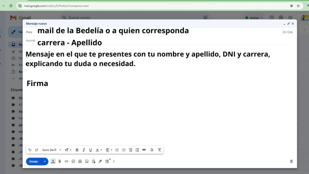- Usá el cuerpo del correo electrónico para detallar cuál es tu necesidad o duda. No te olvides de presentarte con tu nombre y apellido completo, tu número de DNI y la carrera que estás cursando. Esta información nos sirve para ayudarte mejor en la respuesta que te demos.